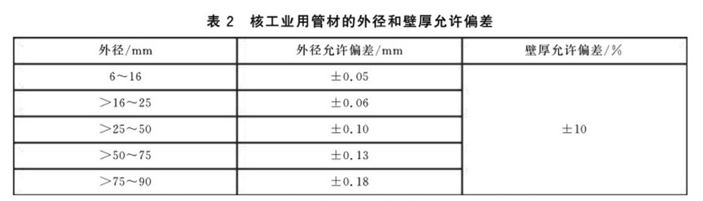 3.3.1 Zr-0、Zr-2和Zr-4管材的外徑和壁厚允許偏差應符合表2的規定。對于Zr-1、Zr-3和Zr-5管材,熱交換器用管材的外徑和壁厚允許偏差應符合表3的規定,一般工業管道用管材的外徑和壁厚允許偏差應符合表4的規定。