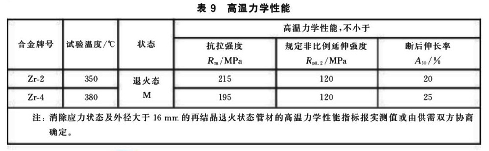3.4.2 需方要求并在合同中注明時,Zr-2和Zr-4管材可進行高溫力學性能檢驗。外徑不大于16mm管材的高溫力學性能應符合表9的規定。